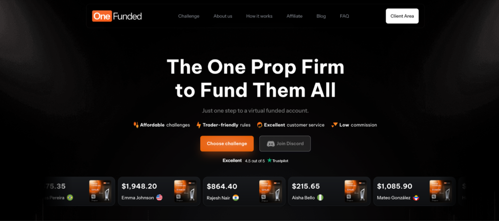 - OneFunded – Best overall for flexibility and easy to follow trading rules.