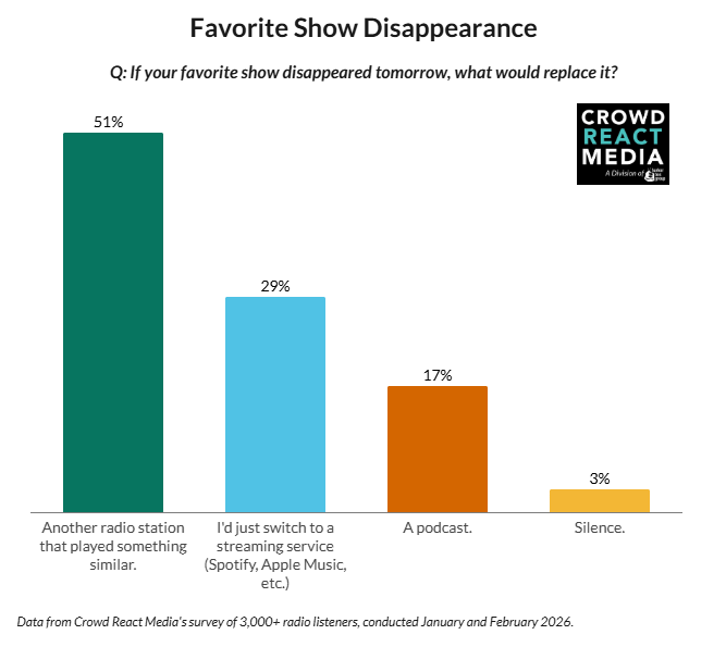 Crowd React Media’s data simply confirms what the best programmers and talent have always understood: when a show disappears, the audience doesn’t just shrug and move on. They go looking for the voice they trusted. If they can’t find it on the dial, they’ll search somewhere else.